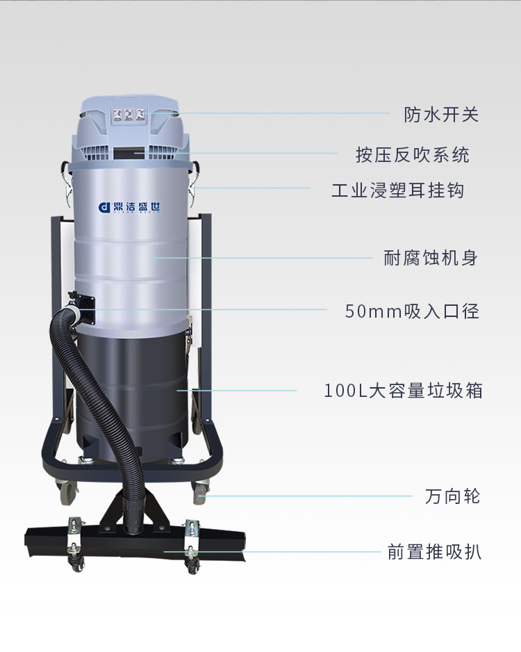 適用場所:工業(yè)專用吸塵器大功率吸力強、干濕兩用、反吹除塵。一站式解決工業(yè)清潔問題,可吸入多種廢料,自帶100升大容量帶滾輪垃圾桶,可獨立拆裝,可快速傾倒雜物。